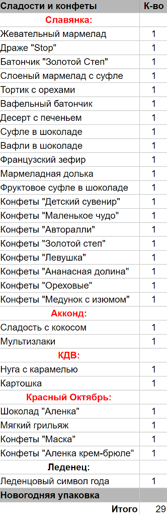 Жевательный мармелад (1 шт), Драже "Stop" (1 шт), Батончик "Золотой Степ" (1 шт), Слоеный мармелад с суфле (1 шт), Тортик с орехами (1 шт), Вафельный батончик (1 шт), Десерт с печеньем (1 шт), Суфле в шоколаде (1 шт), Вафли в шоколаде (1 шт), Французский зефир (1 шт), Мармеладная долька (1 шт), Фруктовое суфле в шоколаде (1 шт), Сладость с кокосом (1 шт), Мультизлаки (1 шт), Нуга с карамелью (1 шт), Картошка (1 шт), Шоколад "Аленка" (1 шт), Мягкий грильяж (1 шт), Леденцовый символ года (1 шт)