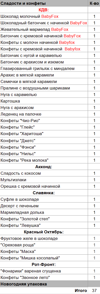 Шоколад молочный (1 шт),  Шоколадный батончик с начинкой (1 шт),  Жевательный мармелад (1 шт),  Батончик с кремовой начинкой (1 шт),  Батончик с нугой и карамелью (1 шт), Батончик с арахисом и изюмом (1 шт),  Глазированный грильяж с миндалем (1 шт), Арахис в мягкой карамели (1 шт), Семечки в мягкой карамели (1 шт), Пралине с воздушными шариками (1 шт), Нуга с карамелью (1 шт), Картошка (1 шт), Нуга с арахисом (1 шт), Леденец на палочке (1 шт), Сладость с кокосом (1 шт), Мультизлаки (1 шт), Орешки с кремовой начинкой (1 шт), Суфле в шоколаде (1 шт), Десерт с печеньем (1 шт), Мармеладная долька (1 шт), Фруктовое желе в шоколаде (1 шт), "Ореховая роща" (1 шт) ,  "Фонарики" Вареная сгущенка (1 шт)