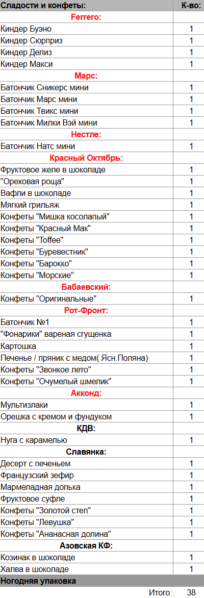 Киндер Буэно (1 шт), Киндер Сюрприз (1 шт), Киндер Делиз (1 шт), Киндер Макси (1 шт), Батончик Сникерс мини (1 шт), Батончик Марс мини (1 шт), Батончик Твикс мини (1 шт), Батончик Милки Вэй мини (1 шт), Батончик Натс мини (1 шт), Фруктовое желе в шоколаде (1 шт), "Ореховая роща" (1 шт), Вафли в шоколаде (1 шт), Мягкий грильяж (1 шт), Батончик №1 (1 шт), "Фонарики" вареная сгущенка (1 шт) ,Картошка (1 шт), Печенье / пряник с медом (1 шт), Мультизлаки (1 шт), Орешка с кремом и фундуком (1 шт), Нуга с карамелью (1 шт), Десерт с печеньем (1 шт), Французский зефир (1 шт), Мармеладная долька (1 шт), Фруктовое суфле (1 шт), Козинак в шоколаде (1 шт), Халва в шоколаде (1 шт)