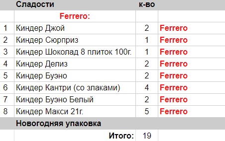 Кол-во сладостей: 19 шт.
