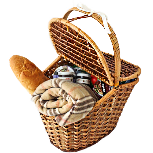 Состав: корзина с крышкой, хлеб,  плед, семечки, 3 паштета разных вкусов, 3 конфитюра, спрей от комаров, влажные салфетки