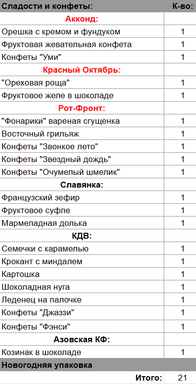 Кол-во сладостей: 21 шт.
