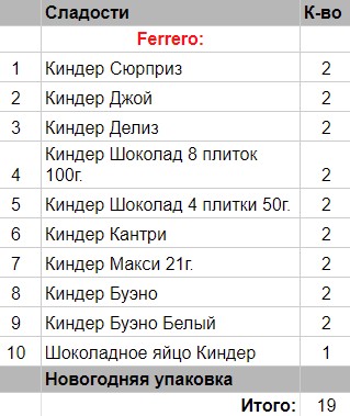 Киндер Шоколад 4 плитки 50 гр. (2 шт), Киндер Делиз (2 шт), Киндер Сюрприз (2 шт), Киндер Кантри (со злаками) (2 шт), Киндер Макси 21 гр. (2 шт), Киндер Джой (2 шт), Киндер Шоколадное яйцо (1 шт), Киндер Шоколад 8 плиток 50 гр. (2 шт), Киндер Буено Белый (2 шт), Киндер Буено (2 шт)