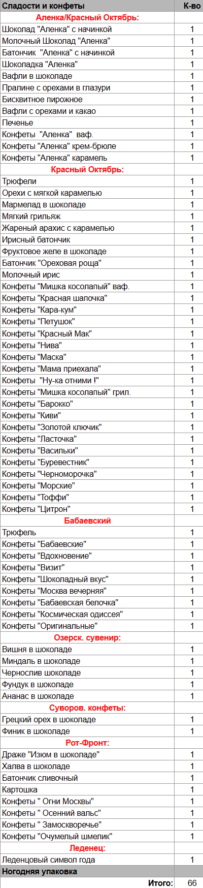 Шоколад "Аленка" с начинкой (1 шт), Молочный Шоколад "Аленка" (1 шт), Батончик  "Аленка" с начинкой (1 шт), Шоколадка "Аленка" (1 шт), Вафли в шоколаде (1 шт), Пралине с орехами в глазури (1 шт), Бисквитное пирожное (1 шт), Вафли с орехами и какао (1 шт), Печенье (1 шт), Трюфели (1 шт), Орехи с мягкой карамелью (1 шт), Мармелад в шоколаде (1 шт), Мягкий грильяж (1 шт), Жареный арахис с карамелью (1 шт) ,Ирисный батончик (1 шт), Фруктовое желе в шоколаде (1 шт), Батончик "Ореховая роща" (1 шт), Молочный ирис (1 шт), Вишня в шоколаде (1 шт), Миндаль в шоколаде (1 шт), Чернослив шоколаде (1 шт), Фундук в шоколаде (1 шт), Ананас в шоколаде (1 шт), Грецкий орех в шоколаде (1 шт), Финик в шоколаде (1 шт), Трюфель (1 шт), Драже "Изюм в шоколаде" (1 шт), Халва в шоколаде (1 шт), Батончик сливочный (1 шт), Картошка (1 шт), Леденцовый символ года (1 шт)