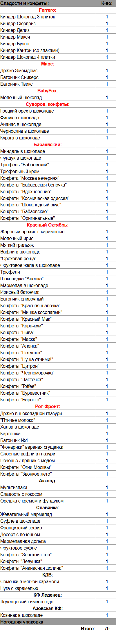 Киндер Шоколад 8 плиток (1 шт), Киндер Сюрприз (1 шт), Киндер Делиз (1 шт), Киндер Макси (1 шт), Киндер Буэно (1 шт), Киндер Кантри (со злаками) (1 шт), Киндер Шоколад 4 плитки (1 шт), Драже Эмемдемс (1 шт), Батончик Сникерс (1 шт), Батончик Твикс (1 шт), Молочный шоколад (1 шт), Грецкий орех в шоколаде (1 шт), Финик в шоколаде (1 шт), Ананас в шоколаде (1 шт), Чернослив в шоколаде (1 шт), Курага в шоколаде (1 шт), Миндаль в шоколаде (1 шт), Фундук в шоколаде (1 шт), Трюфель "Бабаевский" (1 шт), Трюфельный крем (1 шт), Жареный арахис с карамелью (1 шт), Молочный ирис (1 шт), Мягкий грильяж (1 шт), Вафли в шоколаде (1 шт), "Ореховая роща" (1 шт), Фруктовое желе в шоколаде (1 шт), Трюфели (1 шт), Шоколадка "Аленка" (1 шт), Мармелад в шоколаде (1 шт), Ирисный батончик (1 шт), Батончик сливочный (1 шт), Драже в шоколадной глазури (1 шт), "Птичье молоко" (1 шт), Халва в шоколаде (1 шт), Картошка (1 шт),Батончик №1 (1 шт), "Фонарики" вареная сгущенка (1 шт), Слоеные вафли в глазури (1 шт), Печенье / пряник с медом (1 шт), Мультизлаки (1 шт), Сладость с кокосом (1 шт), Орешка с кремом и фундуком (1 шт), Жевательный мармелад (1 шт), Суфле в шоколаде (1 шт), Французский зефир (1 шт), Десерт с печеньем (1 шт), Мармеладная долька (1 шт), Фруктовое суфле (1 шт), Семечки в мягкой карамели (1 шт), Нуга с карамелью (1 шт),Леденцовый символ года (1 шт), Козинак в шоколаде (1 шт)
