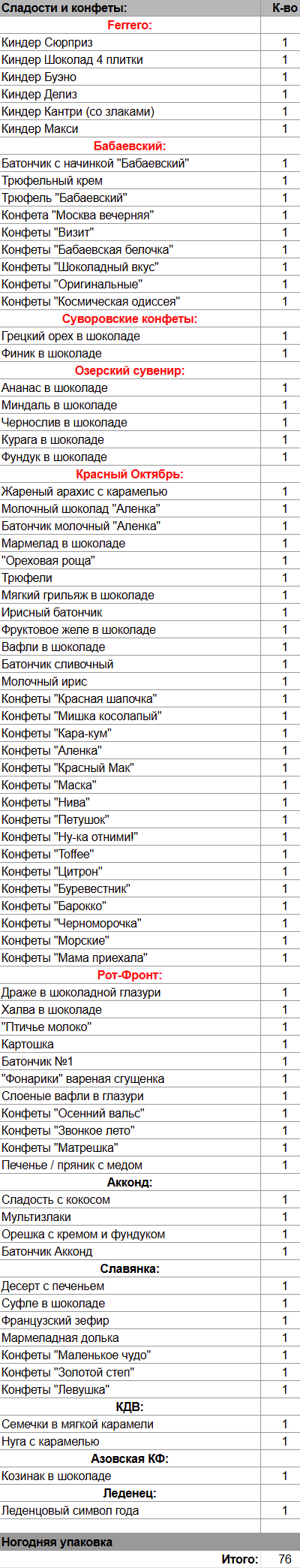 Киндер Сюрприз (1 шт), Киндер Шоколад 4 плитки (1 шт), Киндер Буэно (1 шт), Киндер Делиз (1 шт), Киндер Кантри (со злаками) (1 шт), Киндер Макси (1 шт), Батончик с начинкой "Бабаевский" (1 шт), Трюфельный крем (1 шт), Трюфель "Бабаевский" (1 шт), Грецкий орех в шоколаде (1 шт), Финик в шоколаде (1 шт), Ананас в шоколаде (1 шт), Миндаль в шоколаде (1 шт), Чернослив в шоколаде (1 шт), Курага в шоколаде (1 шт), Фундук в шоколаде (1 шт), Жареный арахис с карамелью (1 шт), Молочный шоколад "Аленка" (1 шт), Батончик молочный "Аленка" (1 шт), Мармелад в шоколаде (1 шт), "Ореховая роща" (1 шт), Трюфели (1 шт), Мягкий грильяж в шоколаде (1 шт), Ирисный батончик (1 шт), Фруктовое желе в шоколаде (1 шт), Вафли в шоколаде (1 шт), Батончик сливочный (1 шт), Молочный ирис (1 шт), Драже в шоколадной глазури (1 шт), Халва в шоколаде (1 шт), "Птичье молоко" (1 шт), Картошка (1 шт), Батончик №1 (1 шт), Слоеные вафли в глазури (1 шт), "Фонарики" вареная сгущенка (1 шт), Печенье / пряник с медом (1 шт), Сладость с кокосом (1 шт), Мультизлаки (1 шт), Орешка с кремом и фундуком (1 шт), Батончик Акконд (1 шт), Десерт с печеньем (1 шт), Суфле в шоколаде (1 шт), Французский зефир (1 шт), Мармеладная долька (1 шт), Семечки в мягкой карамели (1 шт), Нуга с карамелью (1 шт), Козинак в шоколаде (1 шт), Леденцовый символ года (1 шт)