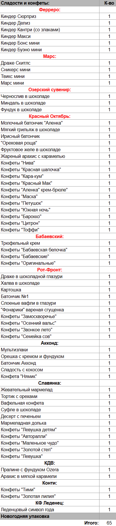Киндер Сюрприз (1 шт), Киндер Делиз (1 шт), Киндер Кантри (со злаками) (1 шт), Киндер Макси (1 шт), Киндер Бонс мини (1 шт), Киндер Буэно мини (1 шт), Драже Скитлс (1 шт), Сникерс мини (1 шт), Твикс мини (1 шт), Марс мини (1 шт), Чернослив в шоколаде (1 шт), Миндаль в шоколаде (1 шт), Фундук в шоколаде (1 шт), Молочный батончик "Аленка" (1 шт), Мягкий грильяж в шоколаде (1 шт), Ирисный батончик (1 шт), "Ореховая роща" (1 шт), Фруктовое желе в шоколаде (1 шт), Жареный арахис с карамелью (1 шт), Трюфельный крем (1 шт), Драже в шоколадной глазури (1 шт), Халва в шоколаде (1 шт), Картошка (1 шт), Батончик №1 (1 шт), Слоеные вафли в глазури (1 шт), "Фонарики" вареная сгущенка (1 шт), Жевательный мармелад (1 шт), Тортик с орехами (1 шт), Вафельная конфета (1 шт), Суфле в шоколаде (1 шт), Десерт с печеньем (1 шт), Мармеладная долька (1 шт), Пралине с фундуком Оzera (1 шт), Арахис в мягкой карамели (1 шт), Мультизлаки (1 шт), Орешка с кремом и фундуком (1 шт), Батончик Акконд (1 шт), Сладость с кокосом(1 шт), Леденцовый символ года (1 шт)