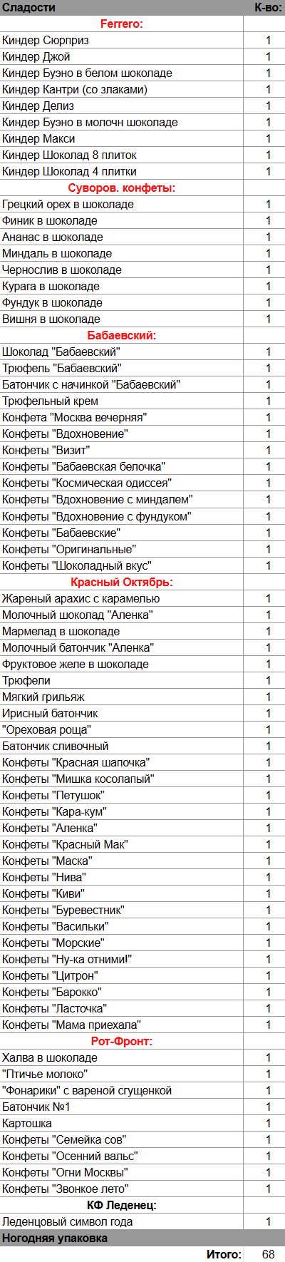 Киндер Сюрприз (1 шт), Киндер Джой (1 шт), Киндер Буэно в белом шоколаде (1 шт), Киндер Кантри (со злаками) (1 шт), Киндер Делиз (1 шт), Киндер Буэно в молочн шоколаде (1 шт), Киндер Макси (1 шт), Киндер Шоколад 8 плиток (1 шт), Киндер Шоколад 4 плитки (1 шт), Грецкий орех в шоколаде (1 шт), Финик в шоколаде (1 шт), Ананас в шоколаде (1 шт), Миндаль в шоколаде (1 шт), Чернослив в шоколаде (1 шт), Курага в шоколаде (1 шт), Фундук в шоколаде (1 шт), Вишня в шоколаде (1 шт), Шоколад "Бабаевский" (1 шт), Трюфель "Бабаевский" (1 шт), Батончик с начинкой "Бабаевский" (1 шт), Трюфельный крем (1 шт), Жареный арахис с карамелью (1 шт), Молочный шоколад "Аленка" (1 шт), Мармелад в шоколаде (1 шт), Молочный батончик "Аленка" (1 шт), Фруктовое желе в шоколаде (1 шт), Трюфели (1 шт), Мягкий грильяж (1 шт), Ирисный батончик (1 шт), "Ореховая роща" (1 шт), Батончик сливочный (1 шт), Халва в шоколаде (1 шт), "Птичье молоко" (1 шт), "Фонарики" с вареной сгущенкой (1 шт), Батончик №1 (1 шт), Картошка (1 шт), Леденцовый символ года (1 шт)