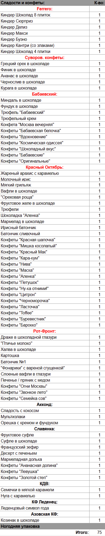 Киндер Шоколад 8 плиток (1 шт), Киндер Сюрприз (1 шт), Киндер Делиз (1 шт), Киндер Макси (1 шт) , Киндер Буэно (1 шт), Киндер Кантри (со злаками) (1 шт), Киндер Шоколад 4 плитки (1 шт) , Грецкий орех в шоколаде (1 шт), Финик в шоколаде (1 шт), Ананас в шоколаде (1 шт), Чернослив в шоколаде (1 шт), Курага в шоколаде (1 шт), Миндаль в шоколаде (1 шт), Фундук в шоколаде (1 шт), Трюфель "Бабаевский" (1 шт), Трюфельный крем (1 шт), Жареный арахис с карамелью (1 шт), Молочный ирис (1 шт), Мягкий грильяж (1 шт), Вафли в шоколаде (1 шт), "Ореховая роща" (1 шт), Фруктовое желе в шоколаде (1 шт), Трюфели (1 шт), Шоколадка "Аленка" (1 шт), Мармелад в шоколаде (1 шт), Ирисный батончик (1 шт), Батончик сливочный (1 шт), Драже в шоколадной глазури (1 шт), "Птичье молоко" (1 шт), Халва в шоколаде (1 шт), Картошка (1 шт), Батончик №1 (1 шт), "Фонарики" с вареной сгущенкой" (1 шт) , Слоеные вафли в глазури (1 шт), Печенье / пряник с медом (1 шт, Сладость с кокосом (1 шт) , Мультизлаки (1 шт), Орешка с кремом и фундуком (1 шт), Фруктовое суфле (1 шт), Суфле в шоколаде (1 шт), Французский зефир (1 шт), Десерт с печеньем (1 шт), Мармеладная долька (1 шт), Семечки в мягкой карамели (1 шт), Нуга с карамелью (1 шт), Леденцовый символ года (1 шт), Козинак в шоколаде (1 шт)