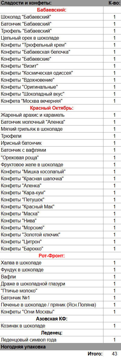 Шоколад "Бабаевский" (1 шт), Батончик "Бабаевский" (1 шт), Трюфель "Бабаевский" (1 шт), Цельный орех в шоколаде (1 шт), Конфеты "Трюфельный крем" (1 шт), Жареный арахис и карамель (1 шт), Батончик молочный "Аленка" (1 шт), Мягкий грильяж в шоколаде (1 шт), Трюфели (1 шт), Ирисный батончик (1 шт), Батончик с вафлями (1 шт), "Ореховая роща" (1 шт), Фруктовое желе в шоколаде (1 шт), Халва в шоколаде (1 шт), Фундук в шоколаде (1 шт), Вафли (1 шт), Драже в шоколадной глазури (1 шт), "Птичье молоко" (1 шт), Батончик №1 (1 шт), Печенье в шоколаде / пряник (1 шт), Козинак в шоколаде (1 шт), Леденцовый символ года (1 шт)