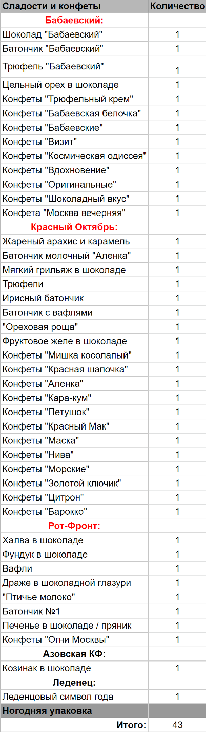 Шоколад "Бабаевский" (1 шт), Батончик "Бабаевский" (1 шт), Трюфель "Бабаевский" (1 шт), Цельный орех в шоколаде (1 шт), Конфеты "Трюфельный крем" (1 шт), Жареный арахис и карамель (1 шт), Батончик молочный "Аленка" (1 шт), Мягкий грильяж в шоколаде (1 шт), Трюфели (1 шт), Ирисный батончик (1 шт), Батончик с вафлями (1 шт), "Ореховая роща" (1 шт), Фруктовое желе в шоколаде (1 шт), Халва в шоколаде (1 шт), Фундук в шоколаде (1 шт), Вафли (1 шт), Драже в шоколадной глазури (1 шт), "Птичье молоко" (1 шт), Батончик №1 (1 шт), Печенье в шоколаде / пряник (1 шт), Козинак в шоколаде (1 шт), Леденцовый символ года (1 шт)