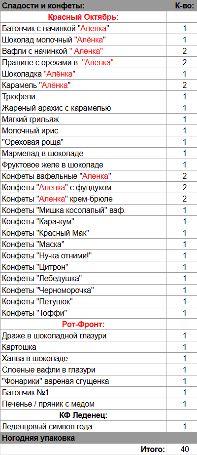 Батончик с начинкой "Алёнка" (1 шт), Шоколад молочный "Алёнка" (1 шт), Вафли с начинкой " Аленка" (2 шт), Пралине с орехами в  "Аленка" (2 шт), Шоколадка "Алёнка" (1 шт), Карамель "Алёнка" (2 шт), Трюфели (1 шт), Жареный арахис с карамелью (1 шт), Мягкий грильяж (1 шт), Молочный ирис (1 шт), "Ореховая роща" (1 шт), Мармелад в шоколаде (1 шт), Фруктовое желе в шоколаде (1 шт), Драже в шоколадной глазури (1 шт), Картошка (1 шт), Халва в шоколаде (1 шт), Слоеные вафли в глазури (1 шт), "Фонарики" вареная сгущенка (1 шт), Батончик №1 (1 шт), Печенье / пряник с медом (1 шт), Леденцовый символ года (1 шт)