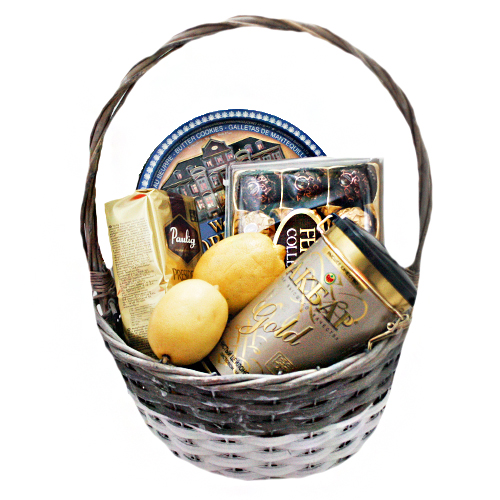 Состав : Корзина, печенье COPENHAGEN 340 гр, кофе молотый-Presidento 275 гр, чай акбар 225 гр, Ferrero Collection 172 гр, лимон 2 шт