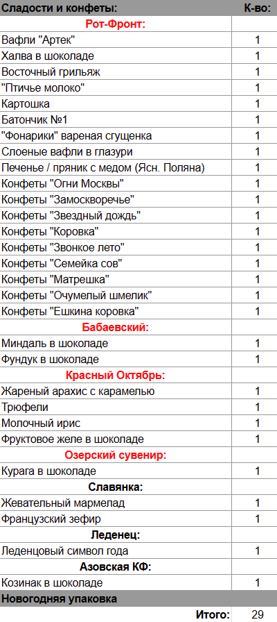Вафли "Артек" (1 шт), Халва в шоколаде (1 шт), Восточный грильяж (1 шт), "Птичье молоко" (1 шт), Картошка (1 шт), Батончик №1 (1 шт), "Фонарики" вареная сгущенка (1 шт), Слоеные вафли в глазури (1 шт), Печенье / пряник с медом (1 шт), Миндаль в шоколаде (1 шт), Фундук в шоколаде (1 шт), Жареный арахис с карамелью (1 шт), Трюфели (1 шт), Молочный ирис (1 шт), Фруктовое желе в шоколаде (1 шт), Курага в шоколаде (1 шт), Жевательный мармелад (1 шт), Французский зефир (1 шт), Леденцовый символ года (1 шт), Козинак в шоколаде (1 шт)
