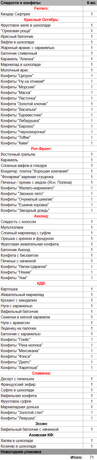 Кол-во сладостей: 71 шт.
